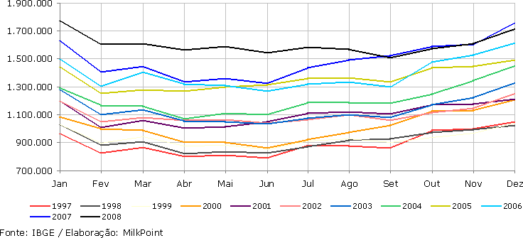 Analisando a captação do quarto trimestre de 2008, de aproximadamente 4,9 bilhões de litros, observa-se estabilidade (-1%) em relação ao mesmo período de 2007 e um crescimento de 6,16% frente ao 4º trimestre de 2006.
