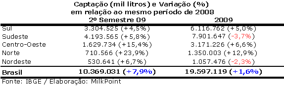 Tabela 2. Captação de leite pelas indústrias por região brasileira (em mil litros) e as respectivas variações em relação ao mesmo período de 2008.