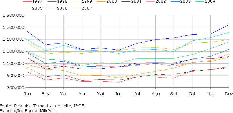 Analisando a captação do quarto trimestre de 2007, também se observa um volume significativo de leite adquirido pelos laticínios, de aproximadamente 4,9 bilhões de litros, o que representou um aumento de 6,2% em relação ao mesmo período de 2006 e de 12,1% frente a 2005.