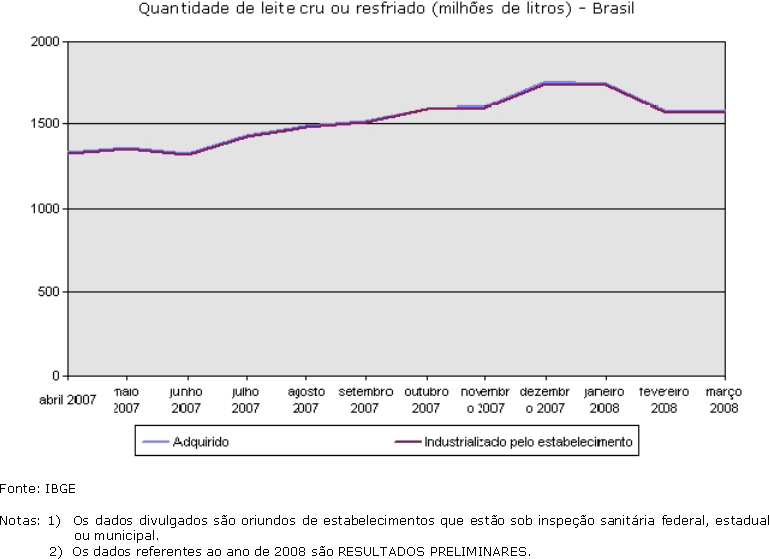 Segundo dados da Pesquisa Trimestral do Leite realizada pelo IBGE (Instituto Brasileiro de Geografia e Estatística), no 1º trimestre de 2008 foram adquiridos 4,893 bilhões de litros de leite pelas indústrias sob inspeção sanitária federal, estadual ou municipal. Esse volume indica um aumento de captação de 9,2%, com relação ao 1º trimestre de 2007, e queda de 1,1% com relação ao 4º trimestre do ano passado. O volume de leite industrializado foi de 4,880 bilhões de litros, representando um aumento de 9,3% em relação ao 1º trimestre de 2007, e queda de 0,9% frente ao 4º trimestre de 2007.