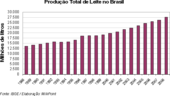 Gráfico 1. Produção de leite de vaca no Brasil de 1988 a 2008, em milhões de litros.