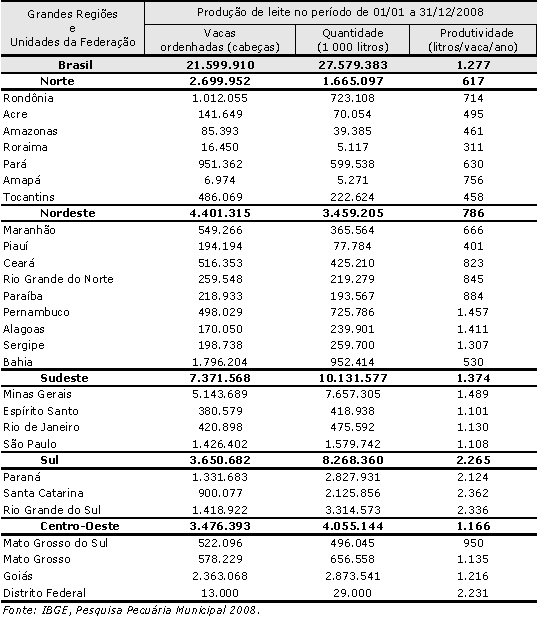 Tabela 1. Produção de leite, vacas ordenhadas e produtividade de leite, por estado brasileiro em 2008.