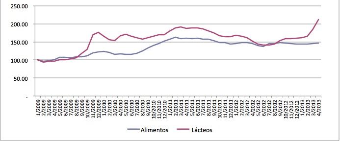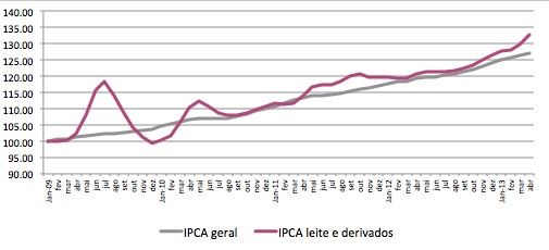Nos últimos 12 meses o IPCA específico de leite e derivados acumulou aumento de 10,19%, com tendência acentuada nos últimos meses. Enquanto o IPCA geral no acumulado do ano foi de 2,05%, e 0,55% no mês de abril, o IPCA da categoria em 2013 foi de 5,09% e no mês de abril 2,33%, aumento bastante superior à categoria de alimentos e bebidas (0,96%).