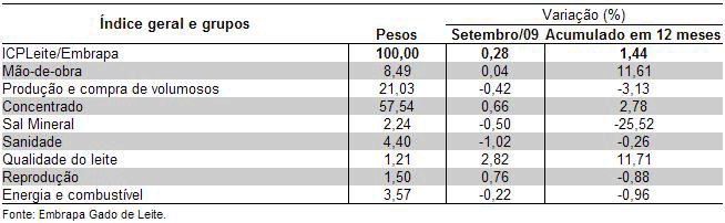 Em relação a outubro de 2008 o ICPLeite/Embrapa registrou alta de 1,44%. Nos últimos 12 meses a maior variação ficou por conta do grupo qualidade do leite, que apresentou alta de 11,71%. A segunda maior aceleração foi em mão-de-obra (11,61%), seguida do grupo concentrado (2,78%). O grupo que apresentou maior desaceleração de preços no período foi sal mineral, com queda de 25,52%. Em seguida ficou produção e compra de volumosos, com variação negativa de 3,13%.