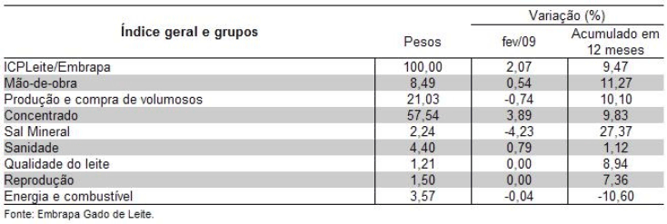 O ICPLeite/Embrapa acumulado do ano (janeiro e fevereiro) foi de 3,74%. Nos últimos doze meses (março 2008 a fevereiro 2009) o ICPLeite/Embrapa registrou alta de 9,47%. A maior variação ficou por conta do grupo sal mineral, que apresentou elevação de 27,37%. A segunda maior alta foi em mão-de-obra (11,27%), seguida do grupo produção e compra de volumosos (10,10%). O grupo que apresentou maior desaceleração foi energia e combustível, com queda de 10,60% no período. A explicação para esta queda está na redução das tarifas de energia praticadas pela concessionária do Estado em meados do ano passado (CEMIG).