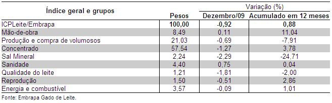 Tabela 1. Estrutura de ponderação do índice do ICPLeite/Embrapa e variações percentuais de dezembro/09 em relação a novembro/09 e o acumulado em 12 meses.