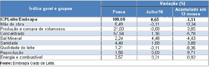 Tabela 1. Estrutura de ponderação do índice do ICPLeite/Embrapa e variações percentuais de julho/2010 em relação a junho/2010 e o acumulado em 12 meses.