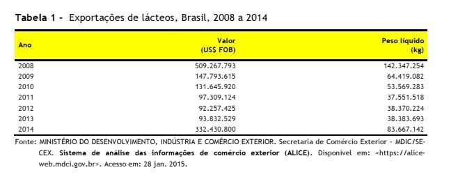 Do lado das exportações, o cenário de 2014 foi favorável aos lácteos do Brasil. Segundo os dados do Ministério do Desenvolvimento, Indústria e Comércio Exterior (MDIC), em 2014 o Brasil aumentou seu faturamento com as exportações de lácteos em 254,3% e o volume em 118,0%, na comparação com 2013 (Tabela 1). As expectativas de vendas brasileiras para Rússia, após o embargo, se concretizaram. Até 2014, estas não ocorriam, mas nesse último ano, apesar do volume ser pequeno (volume de 838.400 kg e valor de U$3.070.982), foi o primeiro passo para ganhar esse mercado.