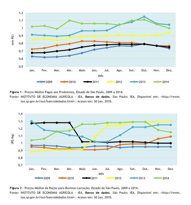 Os preços médios da ração para bovinos em lactação, segundo o IEA, estiveram com cotações altas praticamente o ano todo, com preços, a partir de julho, próximos aos praticados em 2012 (Figura 2). Mesmo com essa alta, o fato não teve grande impacto na produção, pois parte dos produtores tinha silagem suficiente para alimentar o gado.