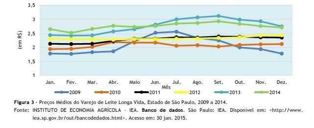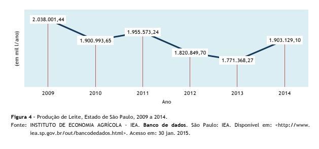 Segundo o IEA, a produção de leite no Estado de São Paulo, em 2012 e 2013, teve queda. Em 2014, se recuperou, mesmo com a seca, em algumas regiões (Figura 4). O resultado foi o aumento de estoques que, em dezembro, cresceu ainda mais devido ao período de festas. O crescimento pode ter ocorrido em função da disponibilidade de alimentos como o milho e silagem (em algumas regiões).