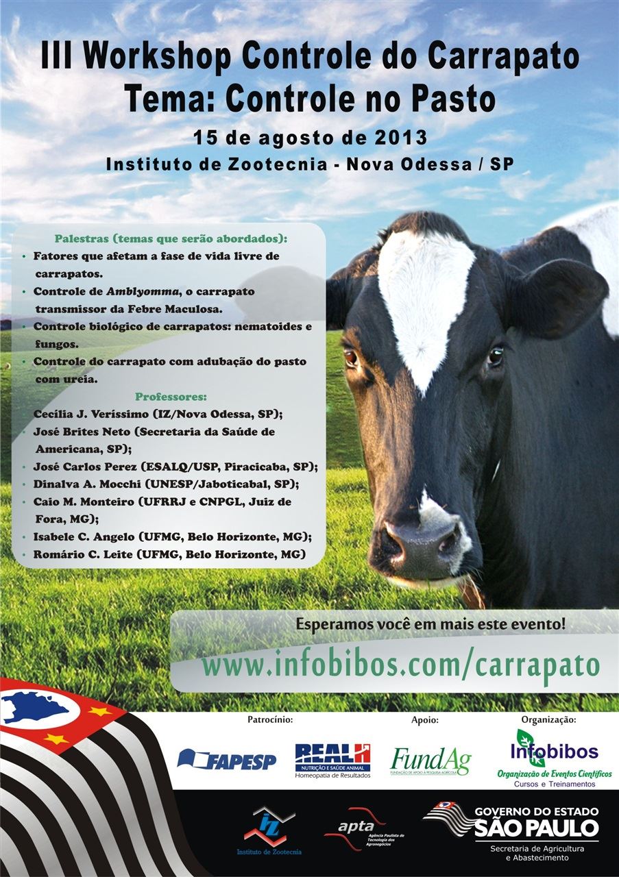 Pensando nisso, há três anos consecutivos, o Instituto de Zootecnia promove evento de um dia, no qual é discutido um tema relacionado ao controle do carrapato. Neste ano de 2013, o tema será o controle na pastagem. Como no pasto também se encontra o carrapato Amblyomma, o transmissor da febre maculosa, doença que pode ser fatal para humanos, palestras sobre o controle desse carrapato também estarão na programação do III Workshop Controle do Carrapato do Boi, programado para acontecer no Instituto de Zootecnia, em Nova Odessa, SP, no dia 15 de agosto de 2013.