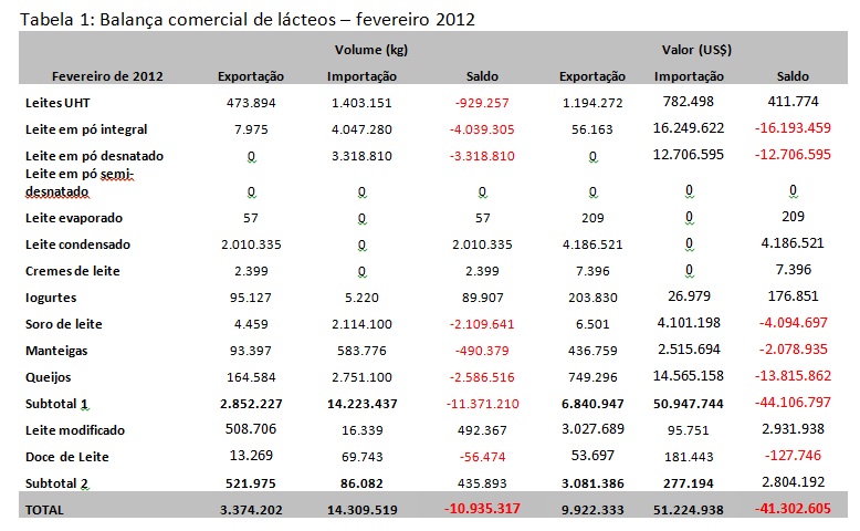 O valor total de produtos lácteos internalizados foi 14.309 toneladas, o que representou o montante de 51.224 mil dólares. O produto de maior impacto nas importações é o leite em pó (incluindo o integral e desnatado), com 7.366 toneladas. Em fevereiro importou-se 4.386 toneladas a menos que janeiro, redução de 37%. O Uruguai ainda é a principal origem desse leite, representando 50% do volume, a Argentina aparece em segundo lugar com 43% e o Chile com apenas 7%.