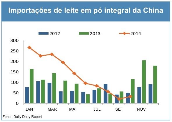 Nos últimos três meses, o leite em pó integral não teve bom desempenho com relação ao ano de 2012, caindo em 41% comparado com agosto a outubro de 2012. As menores importações de leite em pó integral comparado com 2012 poderiam não somente ser um indicativo dos atuais estoques de leite em pó integral da China, mas também, da previsão de que o país poderá precisar importar menos leite em pó integral devido à melhor previsão de produção de leite e, dessa forma, a uma previsão mais forte de leite em pó integral do que há dois anos.