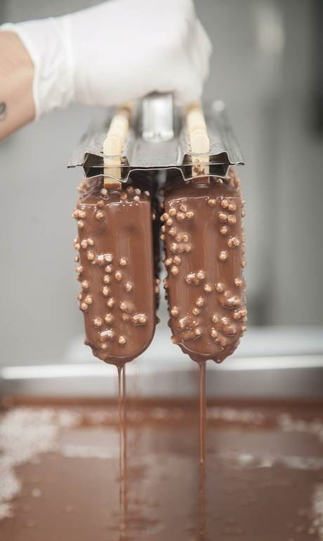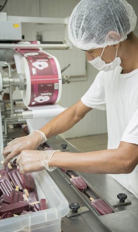 Antes de as frutas irem para o palito, o caminho é longo. O processo inicial é igual ao da massa para sorvete em pote até o ponto da maturação, durando de quatro a seis horas. Depois, as fôrmas, para 28 picolés, são preenchidas manualmente. Num aparelho para resfriamento rápido, em 15 minutos estão prontos para serem desenformados e levados ao freezer por mais cinco minutos, a fim de ganharem a consistência adequada antes de serem embalados numa esteira. Os sabores que têm cobertura são mergulhados no confeito antes da última etapa de congelamento.