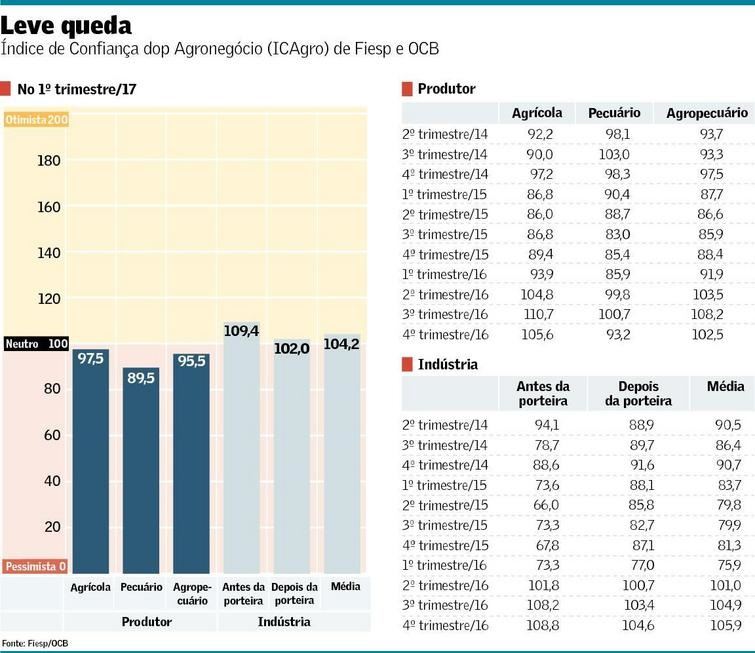 O indicador ficou em 100,5 pontos, em baixa de 3,9 pontos percentuais em relação ao quarto trimestre de 2016 - quando a queda sobre o período anterior foi de 1,9 ponto -, pressionado sobretudo pelo maior pessimismo dos produtores agropecuários, em virtude dos baixos patamares de preços de produtos como soja, milho, açúcar, etanol, boi e mesmo leite, que registrou relativa recuperação.