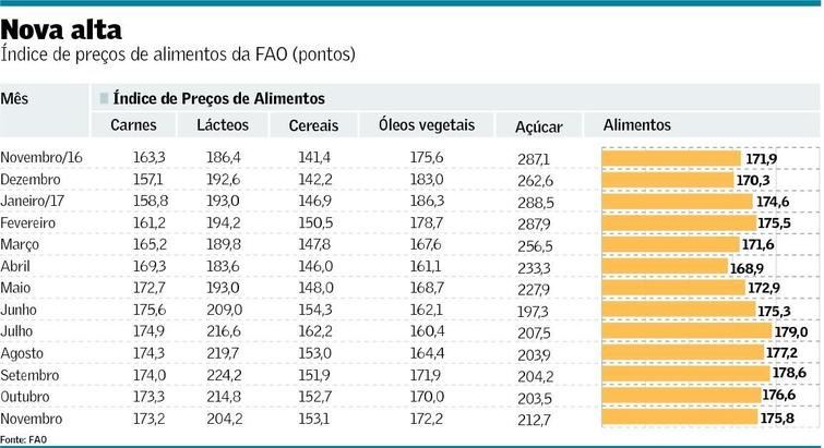 Dos cinco grupos de produtos que compõem o indicador da FAO, dois registraram baixas em novembro sobre o mês anterior: carnes (0,1%), lácteos (4,9%). Em contrapartida, subiram os preços médios dos cereais (0,3%), dos óleos vegetais (1,3%) e do açúcar (4,5%).