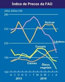 O Índice de Preços de Alimentos da Organização das Nações Unidas para Agricultura e Alimentação (FAO) ficou em média em 196,6 pontos em agosto de 2014, seu menor nível desde setembro de 2010. Em agosto, o índice registrou seu quinto declínio mensal consecutivo, caindo em 7,3 pontos (3,6%) com relação a julho e 7,9 pontos (3,9%) com relação a agosto de 2013. Exceto pela carne, todas as outras categorias de alimentos tiveram queda marcada no índice em agosto, com os valores dos lácteos sendo os que mais caíram.
