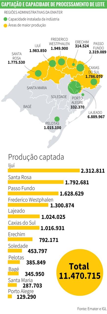 Em 2015, os laticínios gaúchos processaram 3,49 bilhões de litros, quase o mesmo volume que em 2014, quando foram processados 3,43 bilhões de litros. Já a produção total de leite no Estado caiu de 4,69 bilhões de litros em 2014 para 4,59 bilhões de litros em 2015.