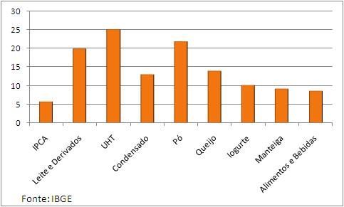 Já o item “Leite e Derivados” teve tendência inversa, caiu 0,81%, tendo como maior queda o leite longa vida, com 2,44% de desvalorização. No entanto, nos últimos 12 meses a categoria leite e derivados teve alta de 19,9% e o leite longa vida (UHT) de 25%. Os outros derivados lácteos tiveram as seguintes variações: leite condensado: +0,39%; leite em pó: +1,58%; queijo: +0,96%; iogurte: +0,51%; manteiga: -0,14%.