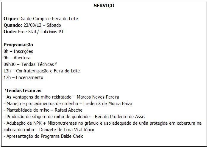 Contando com o know-how dos organizadores do encontro, a programação do Dia de Campo contará com atrações exclusivas sobre o mercado lácteo, entre elas a Feira do Leite. A exposição promoverá o diálogo entre produtores e indústrias para a aprimoração de técnicas para a captação do leite. “Temos buscado a cada dia conhecer mais a realidade dos produtores rurais e levar até eles a qualificação necessária para a manutenção de insumos de qualidade”, explica Rios, que destaca a importância de estabelecer parcerias com todos os membros da cadeia produtiva do leite para o desenvolvimento da bacia leiteira na região. “Atualmente, a microrregião de Lavras é responsável por cerca de 35% do volume de produção do Campo das Vertentes, mas ainda há possibilidades de expansão destes números”, sinaliza.