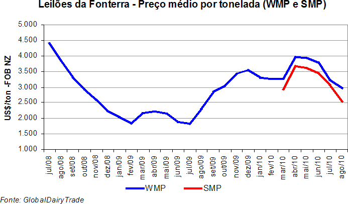 A média dos valores dos contratos para o primeiro período - outubro de 2010 - foi de US$ 2.935/t, apresentando reajuste negativo de 14,8% no índice gDT-WMP, frente ao último leilão. Para o segundo período - novembro de 2010 a janeiro de 2011 -, os contratos foram negociados a US$ 2.936/t, na média, queda de 8,7% frente ao leilão anterior. Os contratos para o terceiro período - fevereiro a abril de 2011 - foram fechados com média de US$ 3.186/t (2,3% superior em relação ao leilão de julho). No total, foram negociadas 37 mil toneladas de leite em pó integral da Nova Zelândia e 1 mil toneladas da Austrália (volume apenas para o 1º período contratual - outubro/10).