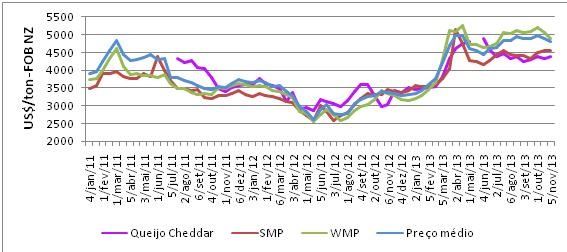 Gráfico 3: Histórico de variação de preços dos produtos lácteos (gDT)