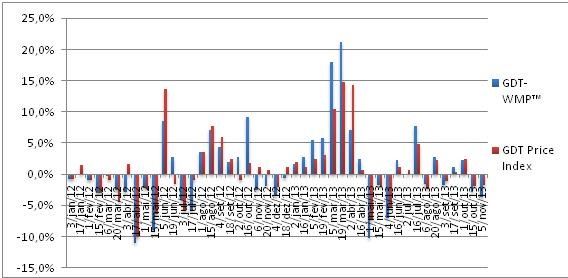 * Ressalta-se que o valor médio dos preços está relacionado aos preços dos contratos negociados no evento, enquanto o índice é uma média ponderada das variações percentuais dos preços dos produtos, e não dos níveis de preços. A variação no valor médio dos preços firmados no leilão não apresenta necessariamente a mesma variação do índice. O objetivo de usar o índice GDT é minimizar distorções no preço médio de vencimento dos contratos. Distorções que podem ser causadas por mudanças no volume demandado entre os produtos que compõem o índice, uma vez que os produtos apresentam diferenças significavas nos preços.