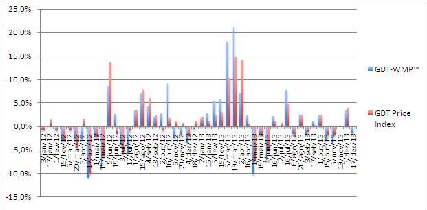 * Ressalta-se que o valor médio dos preços está relacionado aos preços dos contratos negociados no evento, enquanto o índice é uma média ponderada das variações percentuais dos preços dos produtos, e não dos níveis de preços. A variação no valor médio dos preços firmados no leilão não apresenta necessariamente a mesma variação do índice. O objetivo de usar o índice GDT é minimizar distorções no preço médio de vencimento dos contratos. Distorções que podem ser causadas por mudanças no volume demandado entre os produtos que compõem o índice, uma vez que os produtos apresentam diferenças significavas nos preços.