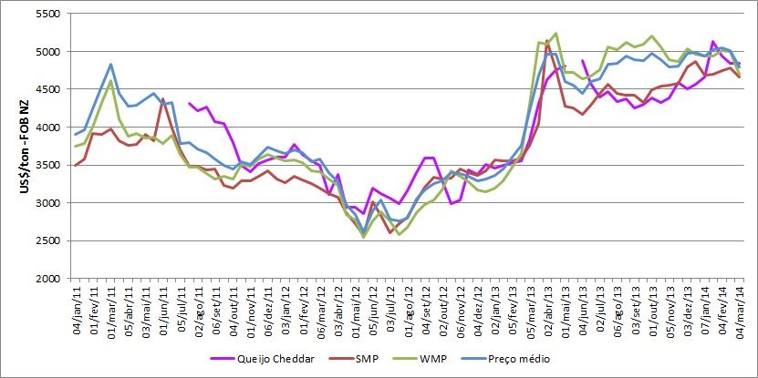 O valor do leite em pó integral teve aumento de 5,70% de acordo com o índice GDT-WMP, sendo cotado a US$ 4.703/tonelada. Já o leite em pó desnatado ficou cotado em US$ 4.658/tonelada, com queda de 2,6% nos preços. O queijo Cheddar teve baixa queda de 0,17% em sua cotação, e vendido a US$ 4.837/tonelada.