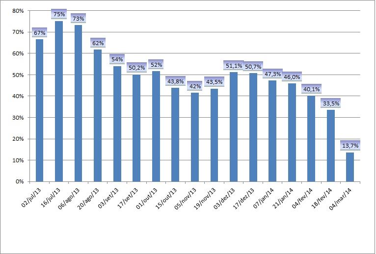 A diferença anual no preço médio dos produtos lácteos apresentou queda novamente nesta quinzena, enquanto neste leilão a diferença foi 13,7% superior ao realizado no mesmo período de 2013. No leilão anterior a diferença havia sido de 33,5%. Apesar dos preços continuarem altos, esta foi a primeira vez que o preço médio retomou a patamares inferiores à US$ 5.000/tonelada se considerados os 4 últimos leilões realizados.