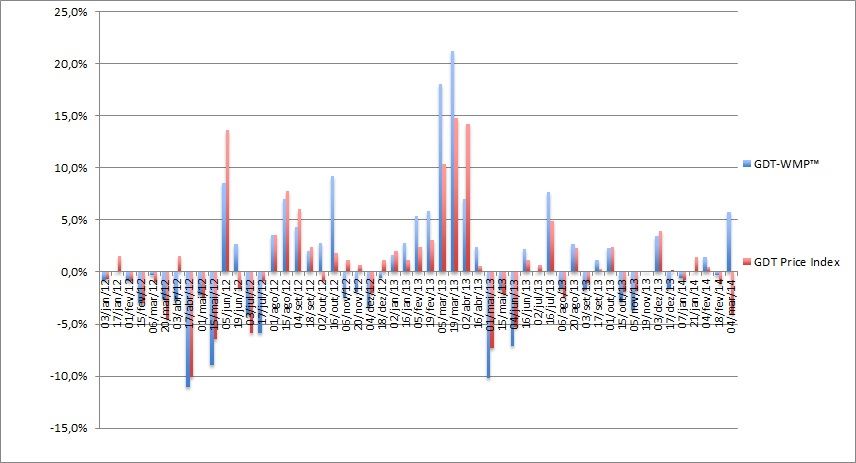 * Ressalta-se que o valor médio dos preços está relacionado aos preços dos contratos negociados no evento, enquanto o índice é uma média ponderada das variações percentuais dos preços dos produtos, e não dos níveis de preços. A variação no valor médio dos preços firmados no leilão não apresenta necessariamente a mesma variação do índice. O objetivo de usar o índice GDT é minimizar distorções no preço médio de vencimento dos contratos. Distorções que podem ser causadas por mudanças no volume demandado entre os produtos que compõem o índice, uma vez que os produtos apresentam diferenças significavas nos preços.