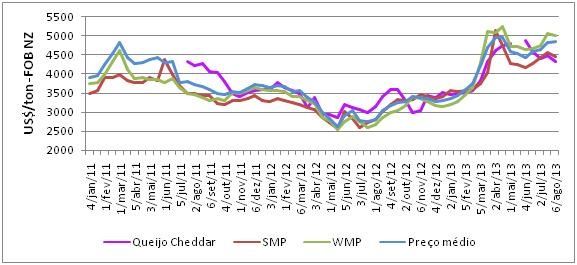 As cotações dos produtos lácteos continuam bem acima das observadas no mesmo período do ano passado. O preço médio dos lácteos está 73% maior que o observado no primeiro leilão de agosto de 2012. O leite em pó integral apresentou diferença ainda maior, sendo cotado a um preço 87% acima do observado no ano passado.