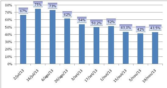 A diferença anual no preço médio dos produtos lácteos apresentou pequena alta nesta segunda quinzena de novembro, enquanto neste leilão a diferença foi 43,5% superior ao realizado em 2012, no leilão anterior a diferença havia sido de 42%.