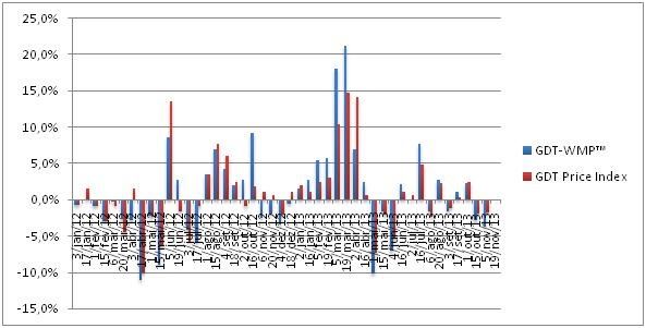 * Ressalta-se que o valor médio dos preços está relacionado aos preços dos contratos negociados no evento, enquanto o índice é uma média ponderada das variações percentuais dos preços dos produtos, e não dos níveis de preços. A variação no valor médio dos preços firmados no leilão não apresenta necessariamente a mesma variação do índice. O objetivo de usar o índice GDT é minimizar distorções no preço médio de vencimento dos contratos. Distorções que podem ser causadas por mudanças no volume demandado entre os produtos que compõem o índice, uma vez que os produtos apresentam diferenças significavas nos preços.