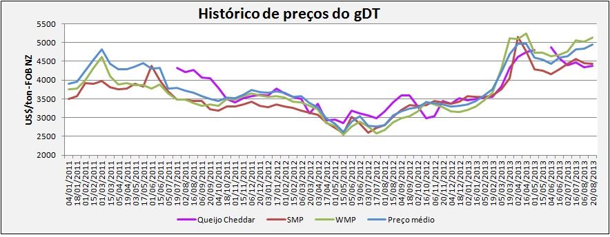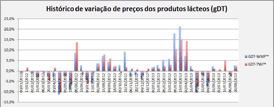 As cotações dos produtos lácteos continuam bem acima das observadas no mesmo período do ano passado. O preço médio dos lácteos está 62% maior que o observado no segundo leilão de agosto de 2012, contudo, em relação ao evento anterior houve redução de 1,9%, considerando o índice geral. O leite em pó integral apresentou diferença ainda maior, sendo cotado a um preço 78,6% acima do observado no mesmo período do ano passado.
