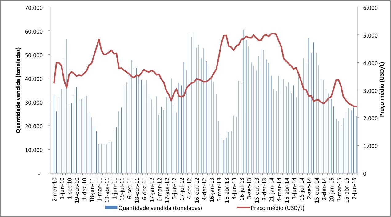 O volume comercializado apresentou queda de 13,2% com relação ao último leilão, com 24.047 toneladas vendidas. Na comparação anual, o volume vendido no leilão foi 25% menor que em 2014. O gráfico abaixo aponta que, desde o segundo semestre de 2014, os volumes vendidos no leilão GDT estão em níveis reduzidos, devido, principalmente, à redução da demanda chinesa por leite em pó.
