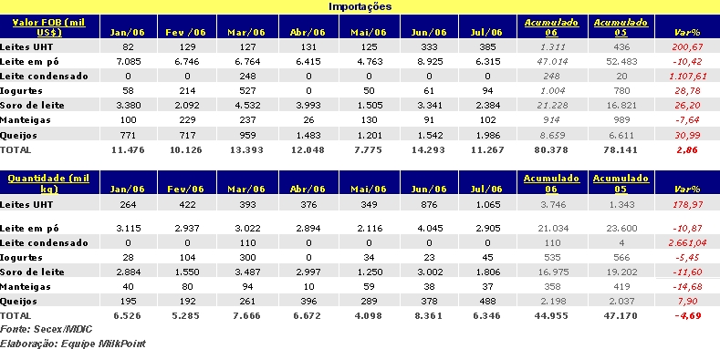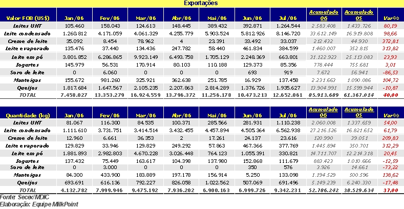 Além disso, o volume das exportações no acumulado do ano de creme evaporado aumentaram 312% em 2006, as de creme de leite 210% (embora esses dois produtos representem pouco no total exportado) e manteigas 138%, além dos 62% de aumento do leite condensado. As maiores reduções foram de soro de leite (-73%) e queijos (-17,5%), conforme as tabelas 1 e 2.