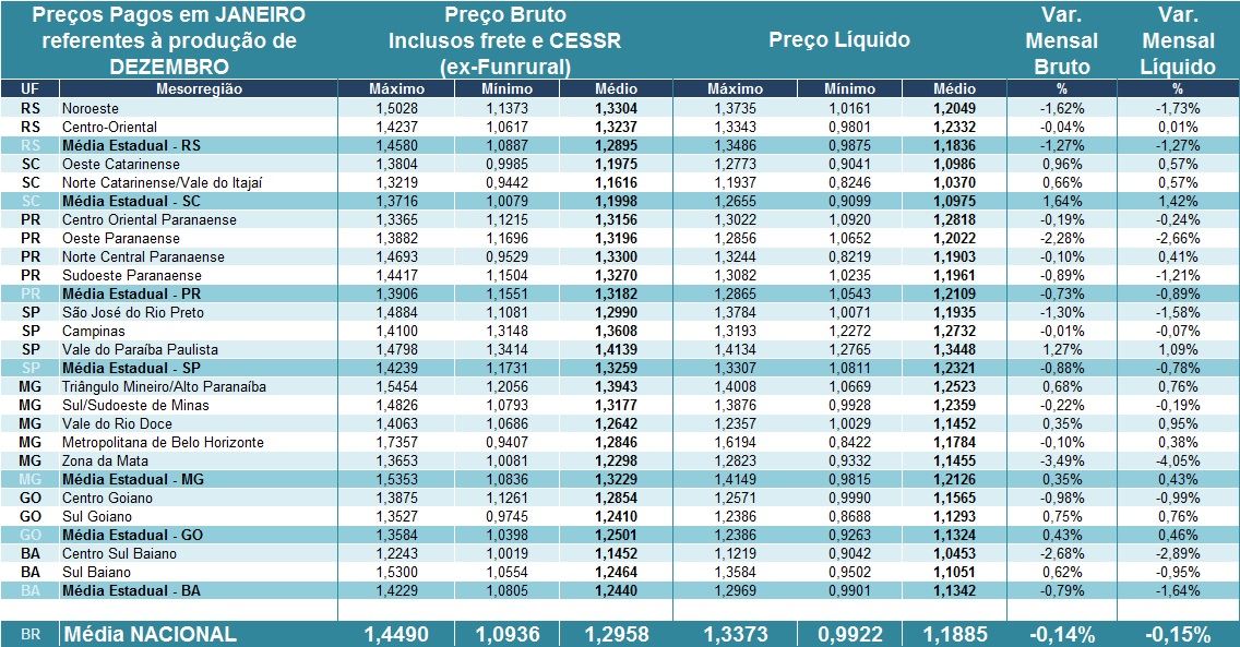 Tabela 1. Preços pagos pelos laticínios (brutos) e recebidos pelos produtores (líquidos) em JANEIRO/17 referentes ao leite entregue em DEZEMBRO/16.