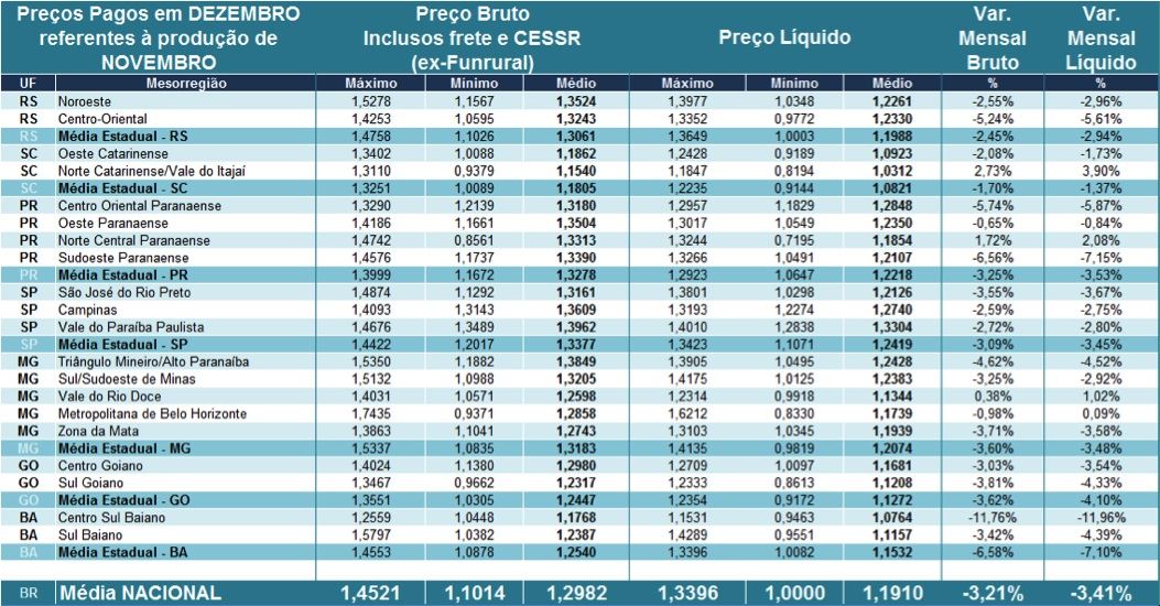 O preço bruto médio do leite (que inclui frete e impostos) caiu 3,2% de novembro para dezembro, passando para R$ 1,2982/litro. As médias calculadas pelo Cepea são ponderadas pelo volume captado em outubro nos estados de GO, MG, PR, RS, SC, SP e BA.