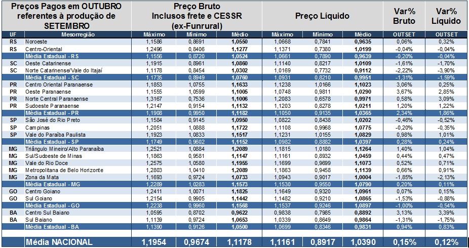 Tabela 1. Preços pagos pelos laticínios (brutos) e recebidos pelos produtores (líquidos) em OUTUBRO referentes ao leite entregue em SETEMBRO