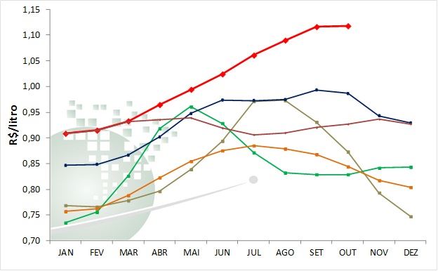 Dentre os estados que compõem a “média Brasil”, Minas Gerais teve o maior preço em outubro, de R$ 1,1573/litro, seguido por Goiás, com média de R$ 1,1568/litro, São Paulo, de R$ 1,1152/litro, Paraná, de R$ 1,1182/litro, Santa Catarina, de R$ 1,0760/litro, Rio Grande do Sul, de R$ 1,0524/litro e, a Bahia, de R$ 1,0500/litro.