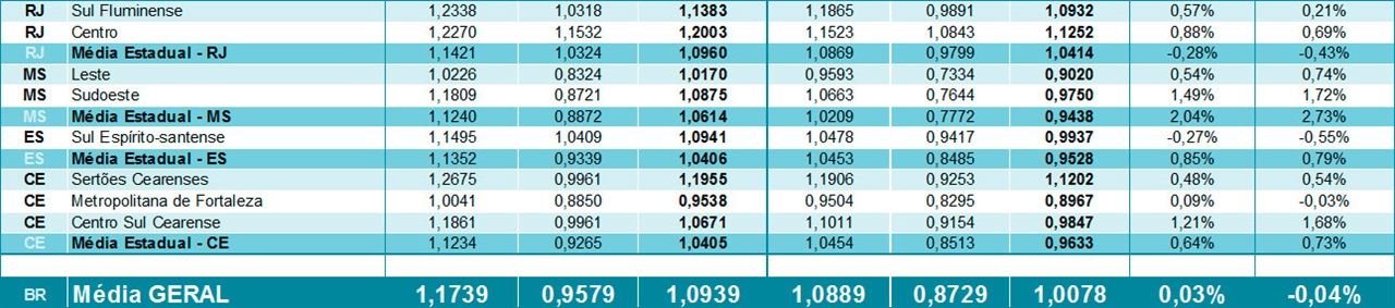 Tabela 2. Preços em estados que não estão incluídos na “média nacional” – RJ, MS, ES e CE.