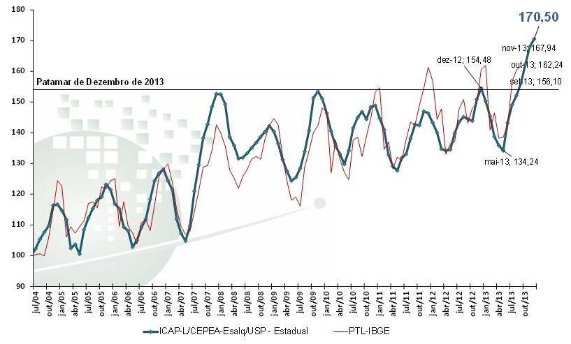 De acordo com o Índice de Captação de Leite do Cepea (ICAP-L/Cepea), o volume captado por laticínios/cooperativas em dezembro/13 aumentou 1,53% em relação ao mês anterior e está no maior nível da série do Cepea, iniciada em 2004 (Base 100). Dentre os sete estados acompanhados, somente São Paulo teve redução, de 1,84%, pois os laticínios estavam com estoques elevados. Vale lembrar que SP teve o maior aumento na captação de outubro para novembro, 8,15%.