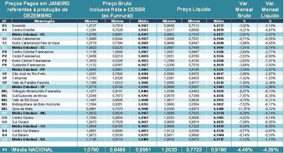 Tabela 1. Preços pagos pelos laticínios (brutos) e recebidos pelos produtores (líquidos) em JANEIRO/14 referentes ao leite entregue em DEZEMBRO/13