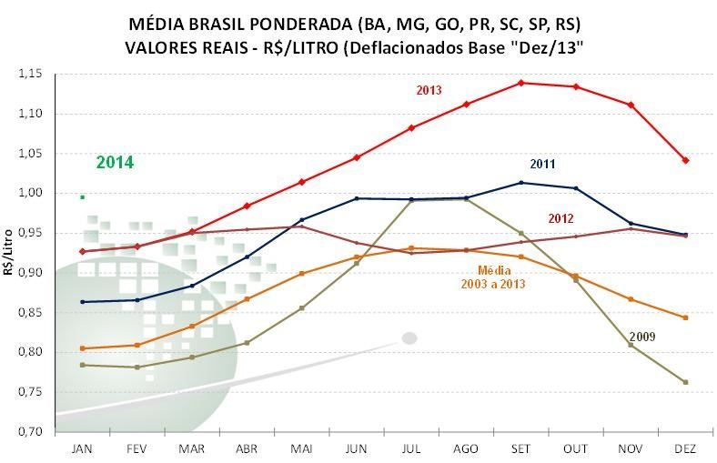 Em janeiro, o preço bruto “nacional” (média ponderada pelo volume captado em dezembro nos estados de GO, MG, PR, RS, SC, SP e BA; valor com frete e impostos) foi de R$ 0,9951/litro, redução de 4,46% ou de 4,6 centavos por litro em relação ao mês anterior. Apesar da queda, a média atual é 7,3% superior à de janeiro/13 em termos reais (valores deflacionados pelo IPCA de dezembro/13). Por sua vez, o preço líquido médio (sem frete e impostos) pago ao produtor foi de R$ 0,9180/litro, baixa de 4,39% ou de 4,2 centavos por litro frente a dezembro/13, mas 13,2% superior a janeiro/13.