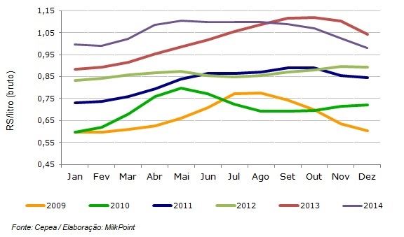 Pesquisadores do Cepea explicam que os altos patamares de preços alcançados em 2013 elevaram os investimentos na atividade leiteira, que resultaram em maior produção neste ano e acúmulo de estoques, principalmente no segundo semestre. Com a oferta elevada, as cotações recuaram no último quadrimestre do ano, após três meses de relativa estabilidade.