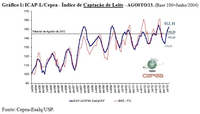 A valorização do leite aconteceu mesmo com o aumento da captação pelas indústrias em agosto. Segundo o Índice de Captação de Leite do Cepea (ICAP-L/Cepea), o volume comprado pelos laticínios cresceu 2,04% em agosto, sendo impulsionado especialmente pela produção do Sul do Brasil. Nessa região, produtores forneceram 4,53% a mais de leite no comparativo com julho. Este avanço na produção continua atrelado ao maior poder de compra do pecuarista em relação à alimentação concentrada e também à qualidade da silagem fornecida no cocho, que juntas aumentam o desempenho das vacas em lactação. Já nos estados do Sudeste, Centro-Oeste e Nordeste, a captação de leite se manteve praticamente estável em agosto, movimento condizente com este período de entressafra de pastagens.
