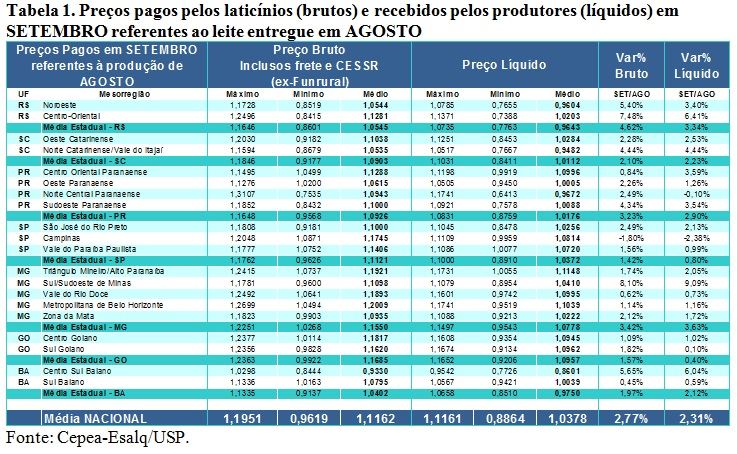 AO PRODUTOR – Em setembro, o preço bruto do leite pago ao produtor voltou a subir em todos os estados da pesquisa do Cepea. Entre os que compõem a “média Brasil”, Goiás continuou tendo o maior preço, com o litro cotado a R$ 1,1685, alta de 1,6% (ou 1,8 centavo por litro) frente à média de agosto. Minas Gerais registrou novamente o segundo maior preço, com média de R$ 1,1550/litro, acréscimo de 3,4% (ou 3,8 centavos/litro) em relação ao mês anterior. Em São Paulo, houve reajuste de 1,4% (ou de 1,6 centavo/litro), com o litro chegando a R$ 1,1121.