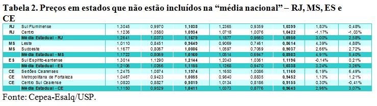 Quanto aos estados que não compõem a “média Brasil” do Cepea, os preços apresentaram o mesmo comportamento. O maior patamar foi verificado no Rio de Janeiro, onde o litro alcançou R$ 1,1679, aumento de 3% (3,4centavos/litro). Na sequência, esteve o Espírito Santo, com média estadual de R$ 1,1155/litro e alta de 3,2% (3,5 centavos/litro). No Ceará, os valores também aumentaram, com variação de 3% (3 centavos/litro) e média de R$ 1,0411/litro. Em Mato Grosso do Sul, o valor pago ao produtor aumentou 4,9% (ou 4,7 centavos/litro), com o litro a R$ 1,0160.