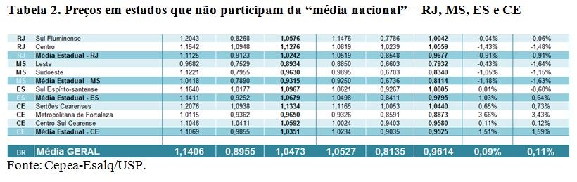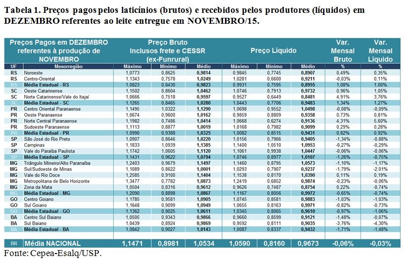 Em dezembro, o preço médio bruto (inclui frete e impostos) pago ao produtor foi de R$ 1,0534/litro, 2,04% menor, em termos reais, que o de um ano atrás. Com exceção dos estados do Sul, que registraram alta nos preços, todas as outras regiões analisadas tiveram quedas que refletem o período sazonal de safra. A maior alta ocorreu em Santa Catarina, de 1,3%, com o litro na média de R$ 1,028 e a maior queda recaiu sobre produtores da Bahia, de 1,7%, onde a média bruta foi de R$ 1,0143/litro.